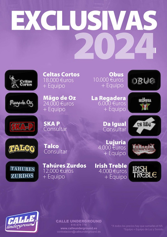 Presentamos los cachés actualizados de nuestras exclusivas para este 2024. Contamos con espectáculos adaptables a todo tipo de evento y recinto. Contactad con nosotros para encontrar una opción que se ajuste a vuestras necesidades. ¡Nos vemos sobre los escenarios! contratacion@calleunderground.es Móvil: +(34) 616878776
